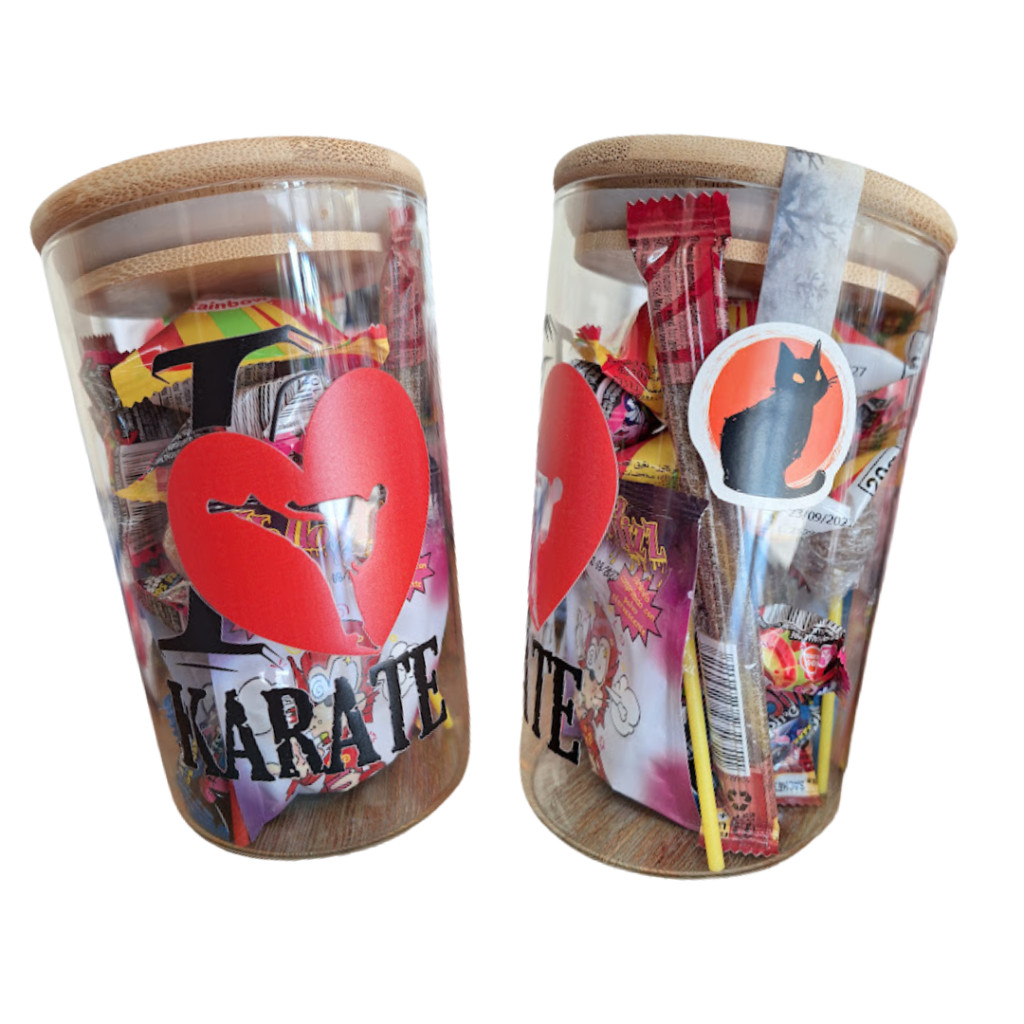 Édesség mix, üvegtárolóban I LOVE KARATE mintával.